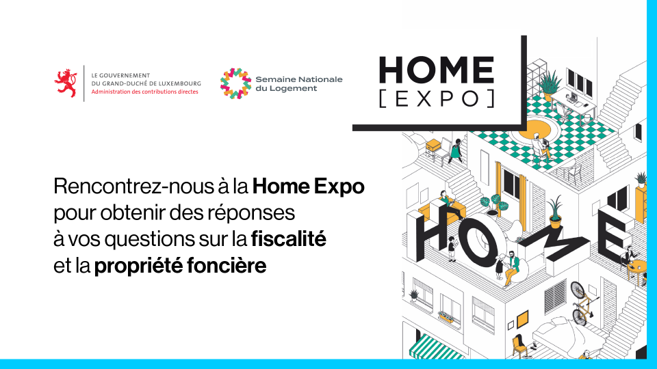 L’Administration des contributions directes sera présente au salon « Home Expo », qui se tiendra à Luxexpo The Box du 9 au 12 octobre 2025. Nos experts répondront à vos questions sur la fiscalité et la propriété foncière. Ne manquez pas cette occasion !